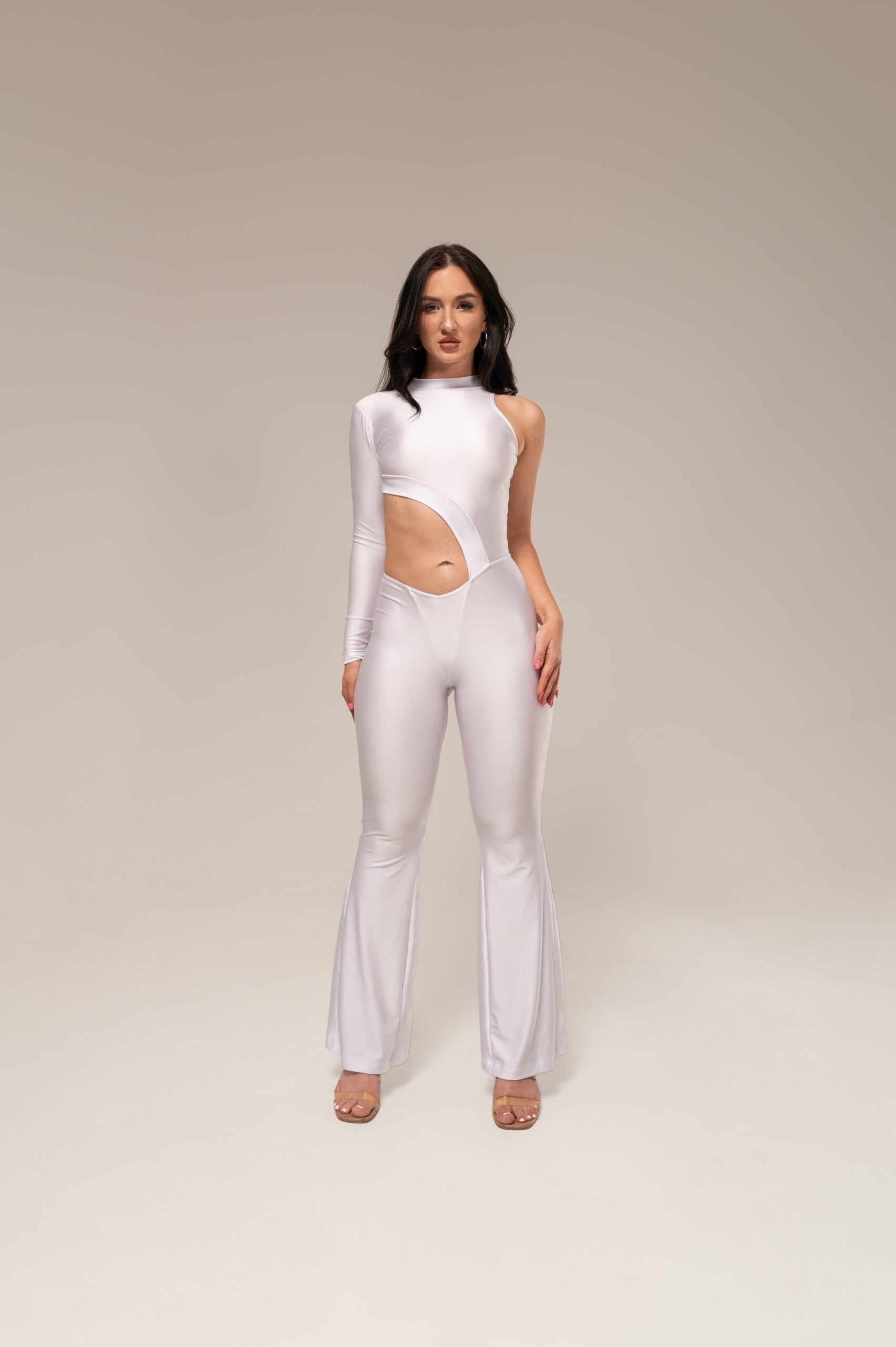 Step into the spotlight with this striking asymmetrical jumpsuit, expertly designed to make a bold statement. Featuring a captivating cut-out on one side of the waist, this piece beautifully contrasts with its structured long pants on the opposite side. The top showcases a stylish mix of a fitted long sleeve and an alluring sleeveless design, allowing for a playful yet sophisticated look. Crafted from high-quality, breathable fabric, this jumpsuit is perfect for those who appreciate a blend of modern flair and timeless elegance.