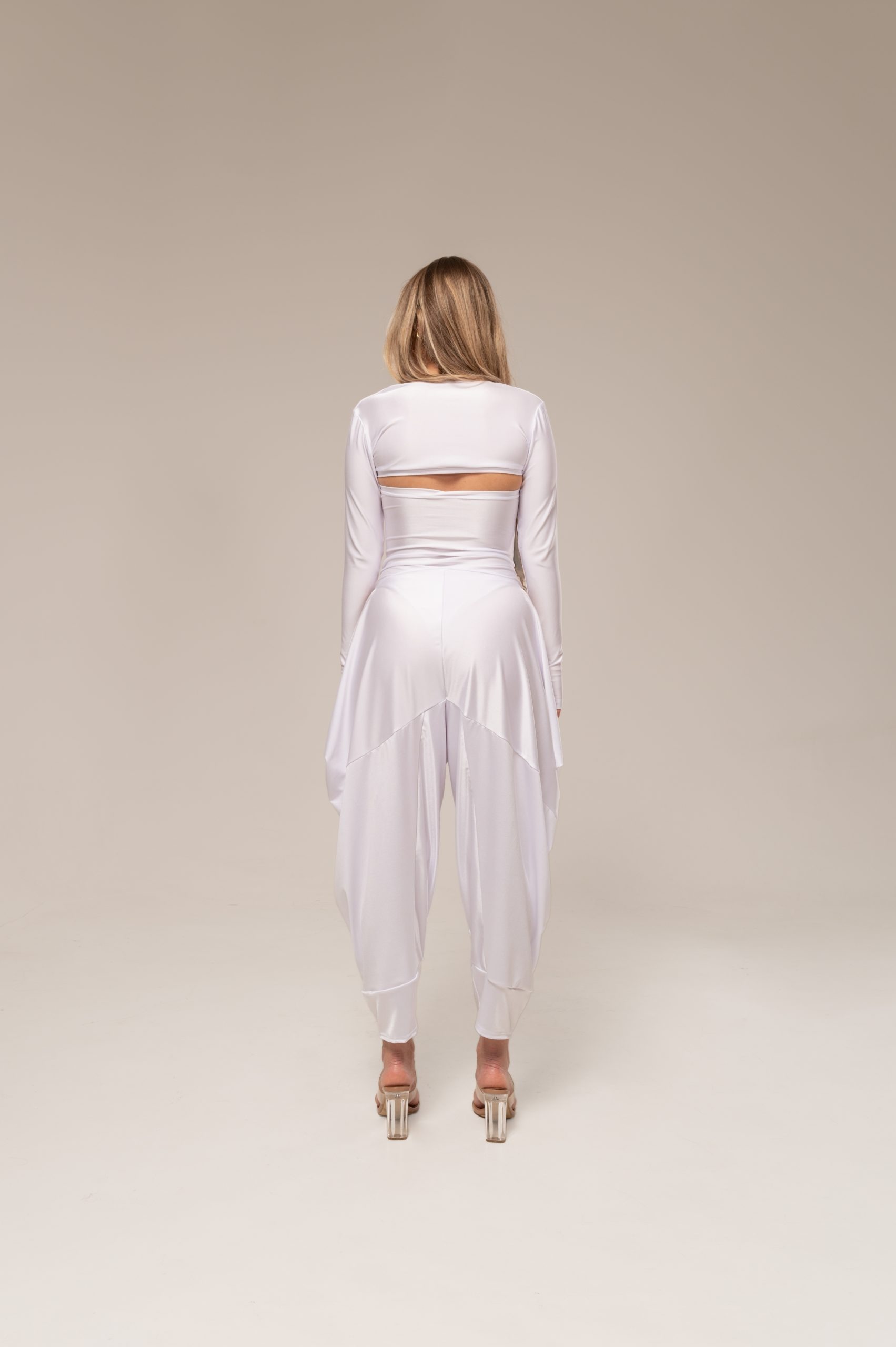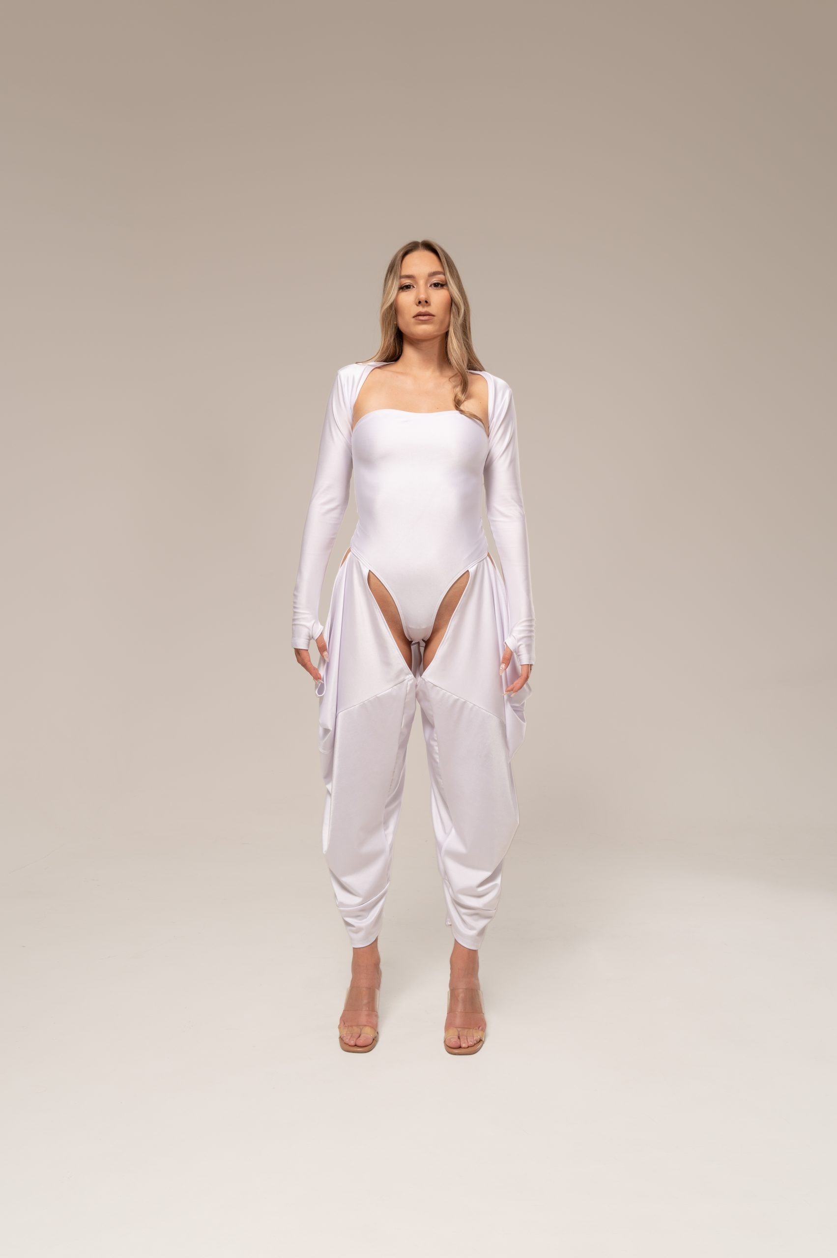Features: Fitted bodysuit top, attached baggy pants, unique design