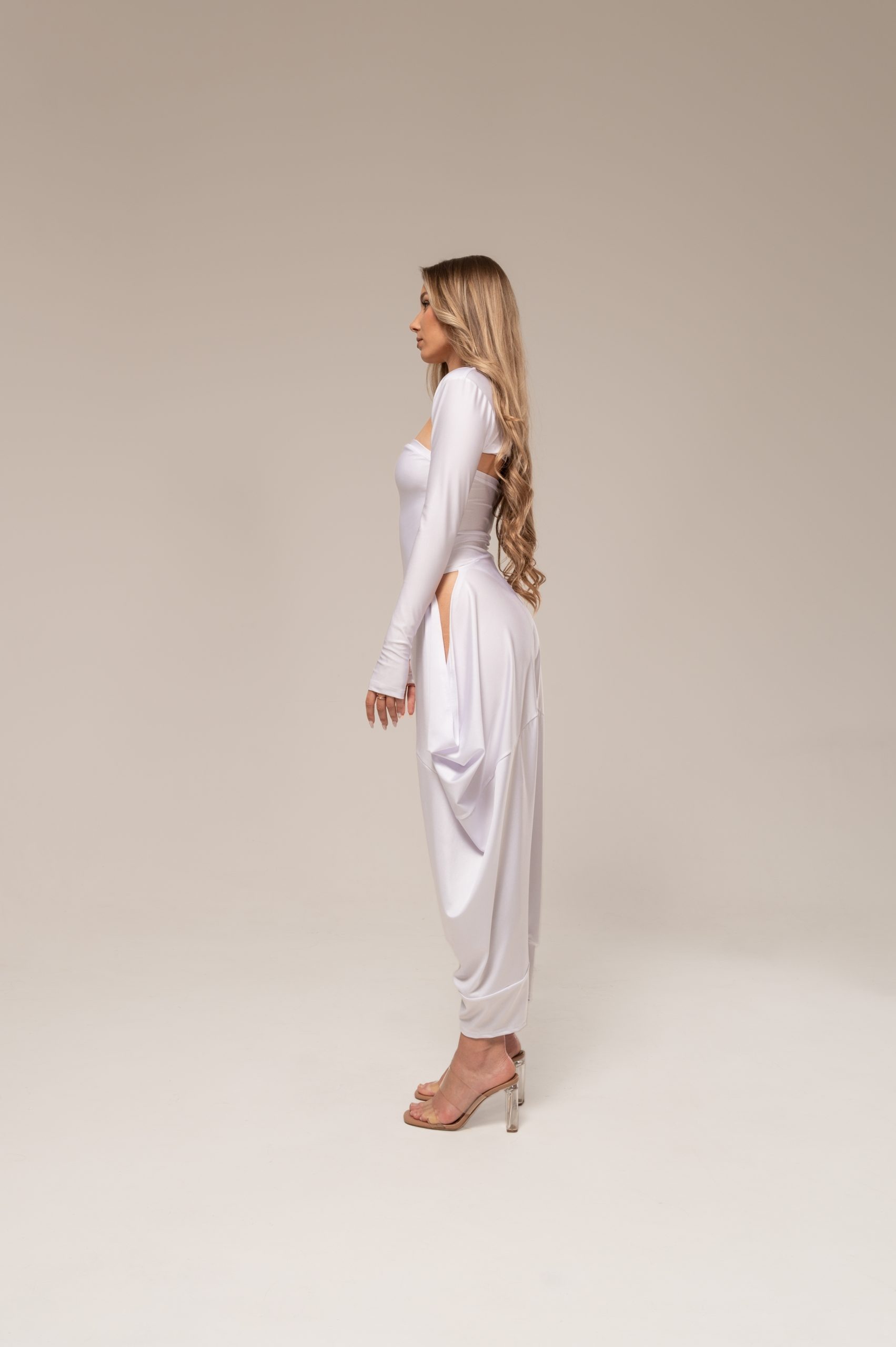 Step into the spotlight with this one-of-a-kind jumpsuit that merges the sleek elegance of a bodysuit with the relaxed vibe of baggy pants. Crafted from eco-friendly, sustainable materials, this ensemble is as kind to the environment as it is stylish. The fitted bodice connects seamlessly to flowy, voluminous pants, creating a bold and avant-garde silhouette. Perfect for those who love to make a statement, this jumpsuit is the ultimate blend of comfort and high fashion.